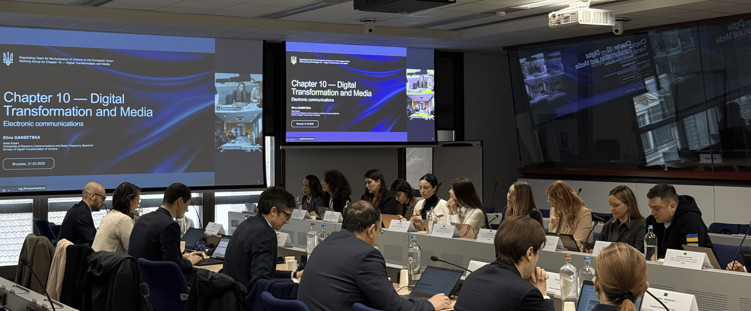 У Брюсселі відбулася зустріч у межах скринінгу відповідності законодавства України праву ЄС за переговорним розділом 10 «Цифрова трансформація та медіа», який координує Мінцифра. Українську делегацію очолила головний переговірник — Віцепрем’єр-міністр з питань європейської та євроатлантичної інтеграції України — Міністр юстиції України — Ольга Стефанішина.