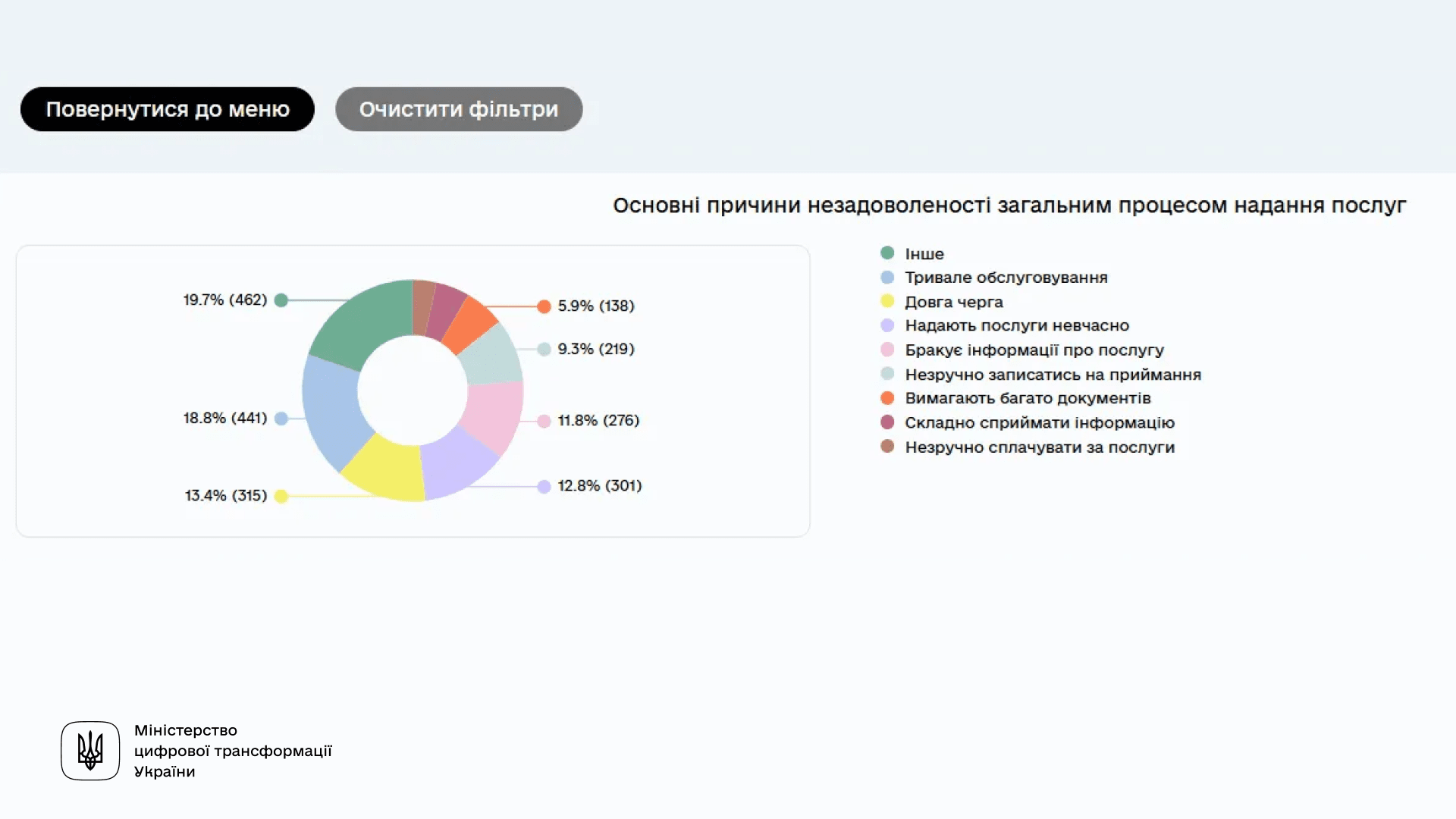 Головні проблеми в процесі надання послуг стосуються швидкості обслуговування: тривале обслуговування турбує 18,8% незадоволених відвідувачів, а повільне надання послуг — 13,4%. Разом ці дві проблеми становлять майже третину негативних відгуків.