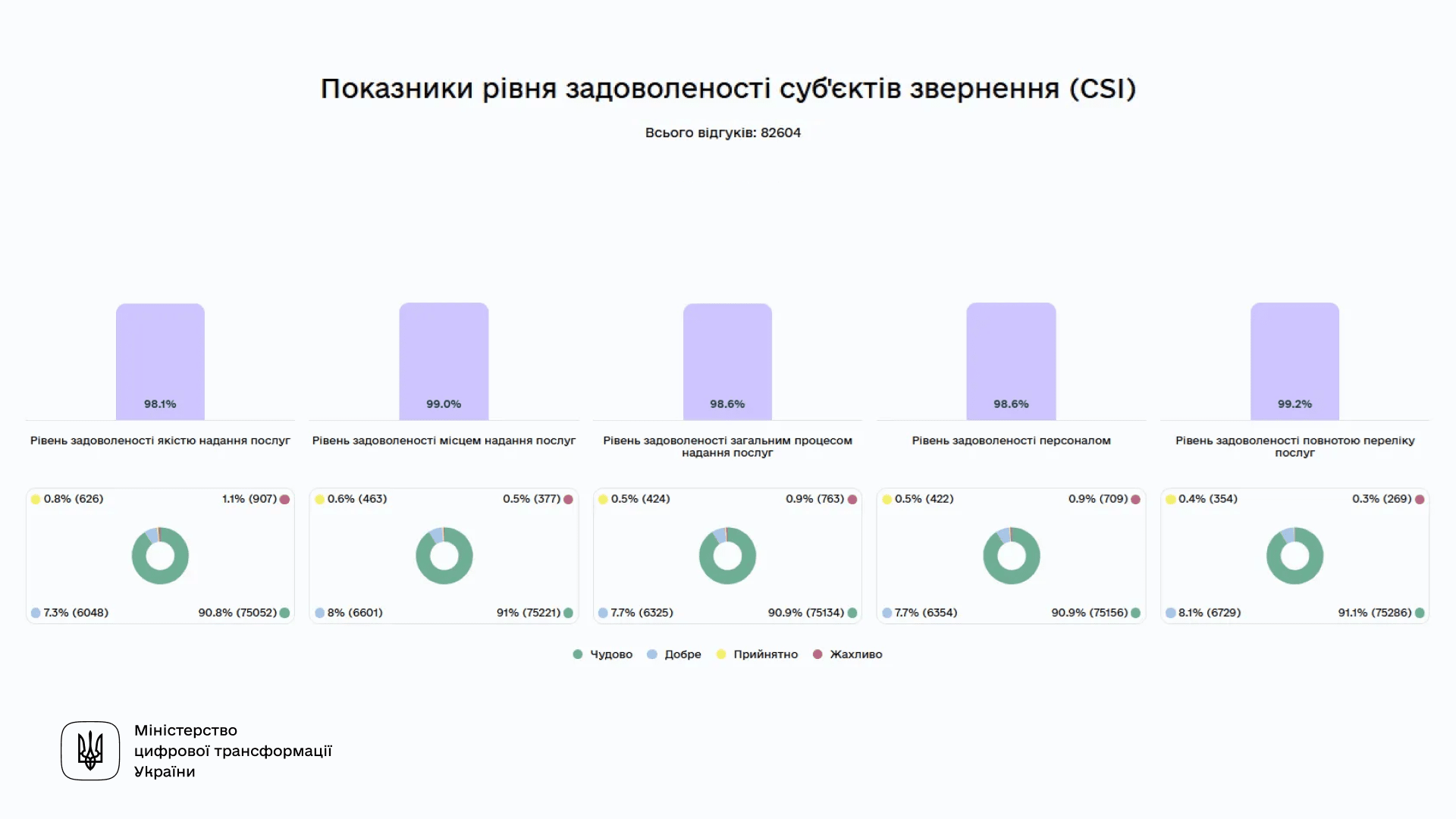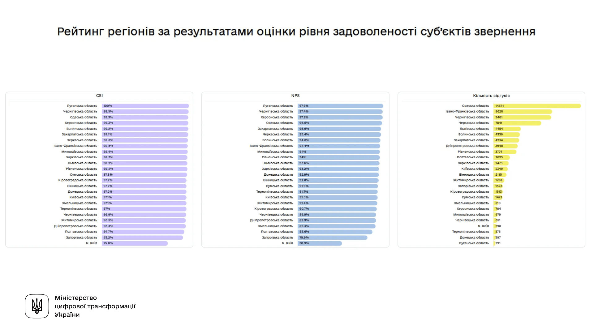 За індексом задоволеності клієнтів (CSI), ЦНАПи Чернігівської (99,5%) та Одеської (99,3%) областей мають високі показники оцінки якості послуг. Найнижчі — зафіксовані у Києві — регіон демонструє 75,8%.