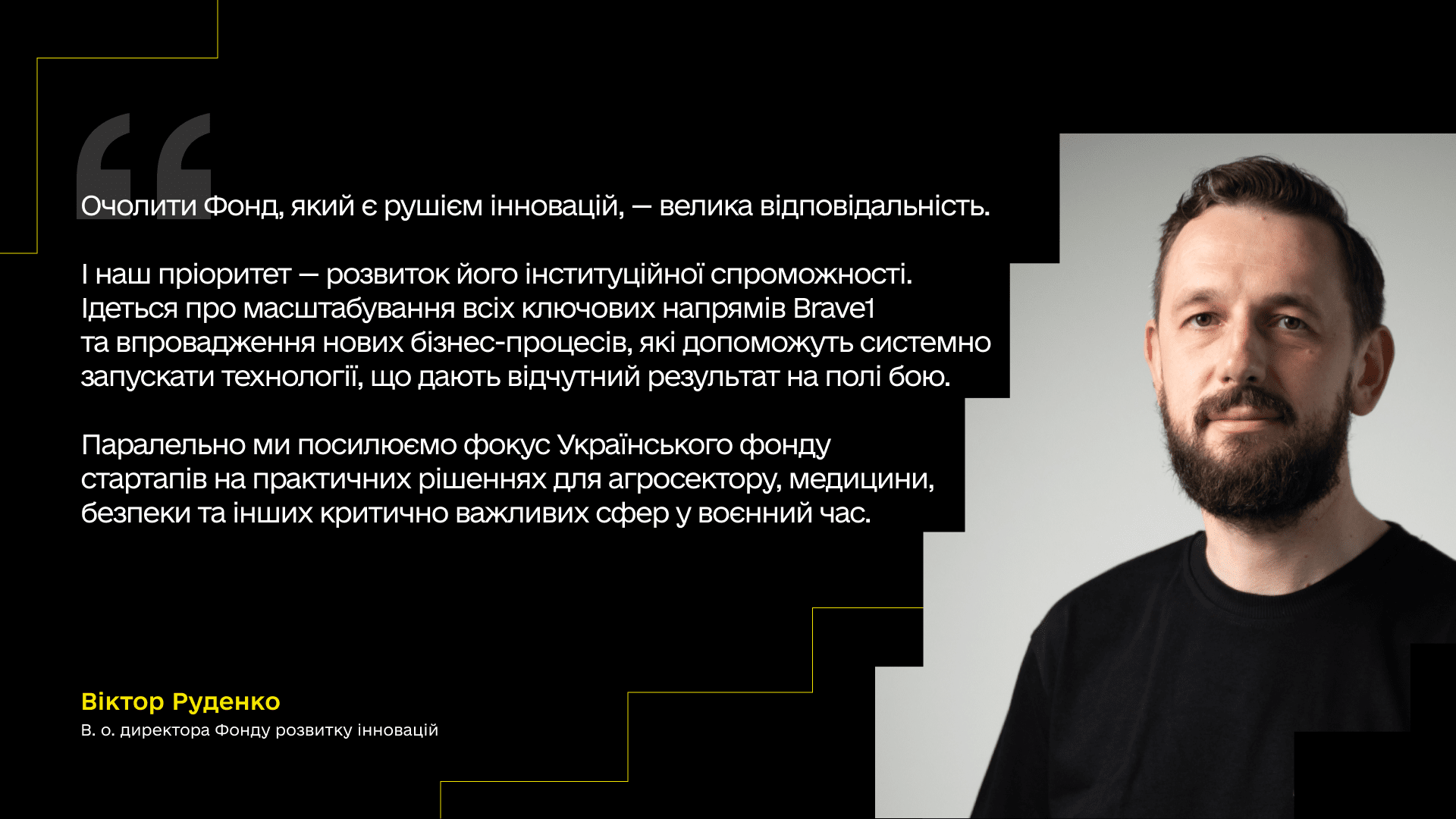 В. о. директора Фонду розвитку інновацій Віктор Руденко має понад 15 років досвіду в державному управлінні, зокрема в Міністерстві юстиції і Міністерстві розвитку громад та територій. З 2022 року як експерт Digital for Freedom та EGAP відповідав за розробку ключових нормативно-правових актів, які спростили процес закупівель інноваційного озброєння й дали поштовх до формування ринків БпЛА та РЕБ (постанова КМУ № 256) і боєприпасів (постанова КМУ № 763).