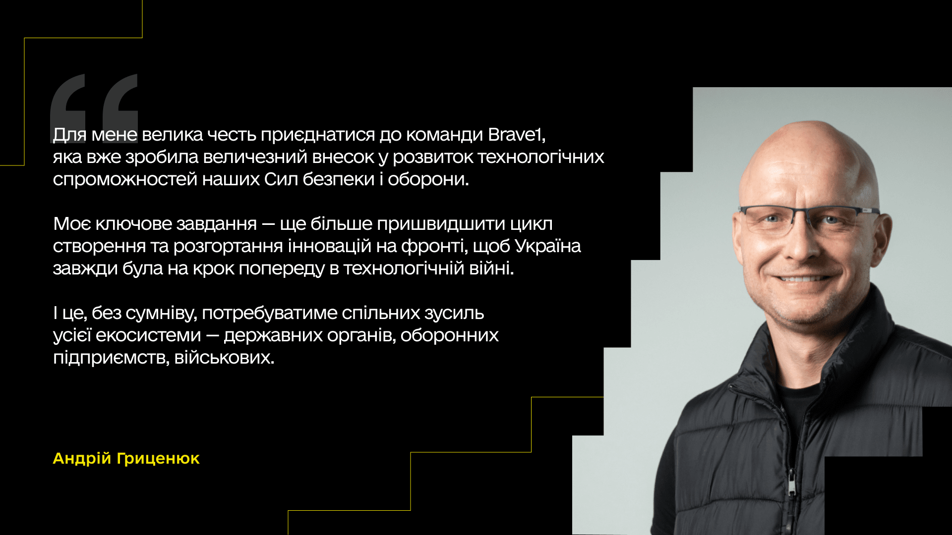 У Brave1 Андрій Гриценюк відповідатиме за пошук і менеджмент розробки технологій, здатних створювати перевагу на полі бою, і їх подальше впровадження та масштабування на фронті. Він також зосередиться на координації роботи з урядом, Генштабом та військовими підрозділами для розвитку спроможностей українського сектору defense tech та формування системи, що даватиме змогу оперативно реагувати на технологічні виклики війни.