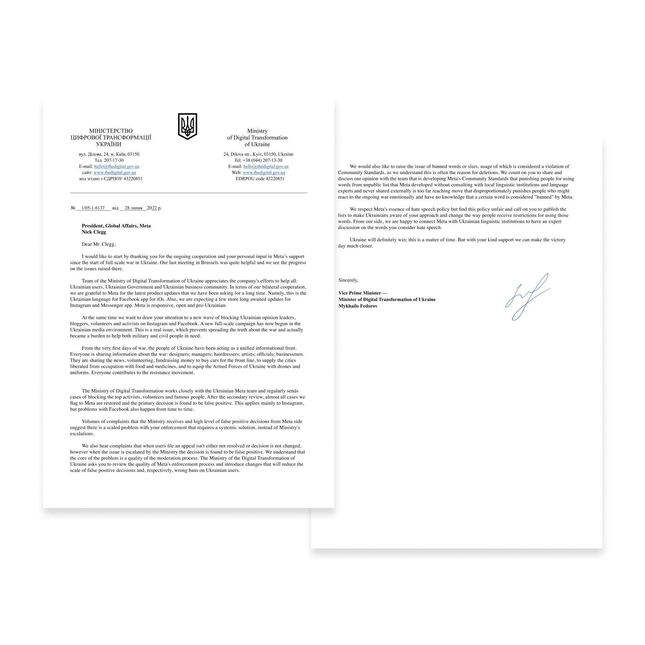 «У той час, коли російська пропаганда залишається в полі зору, пости української медіаспільноти стали чутливим контентом для світу. Соцмережі створені для того, щоб розповідати правду. Але не можемо це робити достатньо коли політики соціальних мереж створені лише для мирного часу. Ми розуміємо політику Meta щодо ненависті, але вважаємо несправедливим блокування акаунтів та приховування постів. Ми знаємо, що Україна переможе. Але із вашою допомогою це станеться набагато швидше», — зазначив Віцепрем’єр-міністр — Міністр цифрової трансформації України Михайло Федоров.